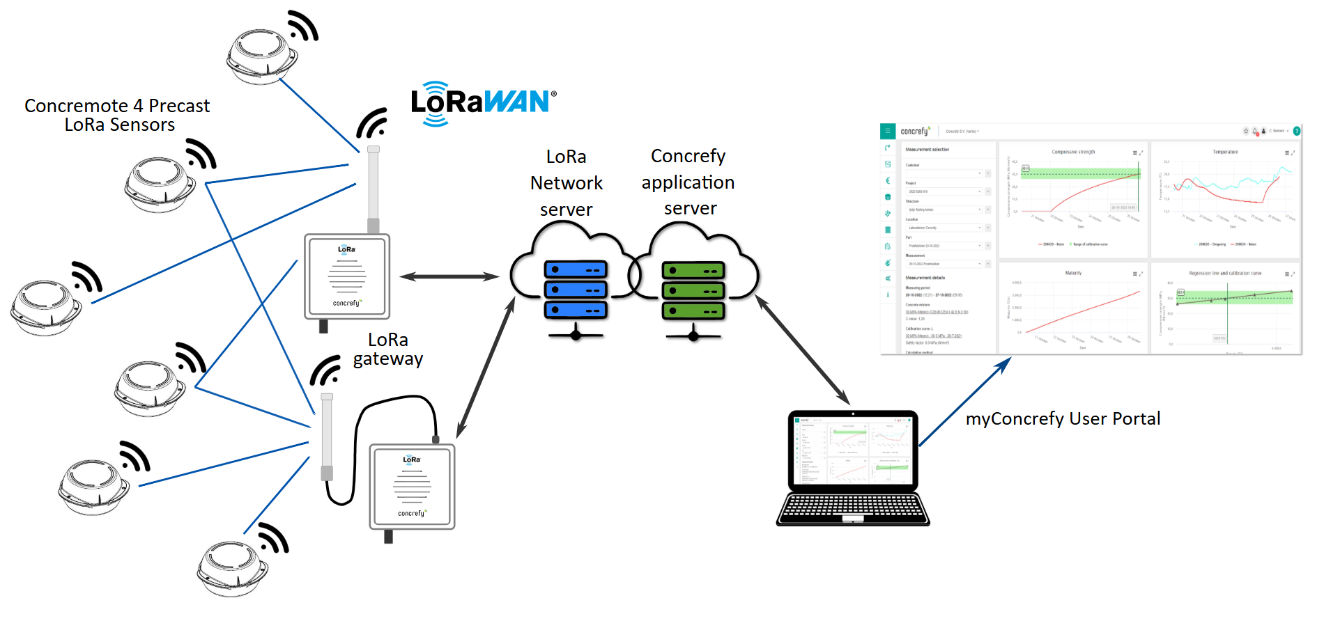 • Communication via LoRa and private LoRa network gateway which allows real data every 10 minutes even in curing chambers. Those chambers are signal closed environments so GSM signal can not enter those areas. With our local LoRa gateway solution, an inner antenna is installed to retrieve data during curing. Private LoRa networks are easy expandable to cover difficult areas.